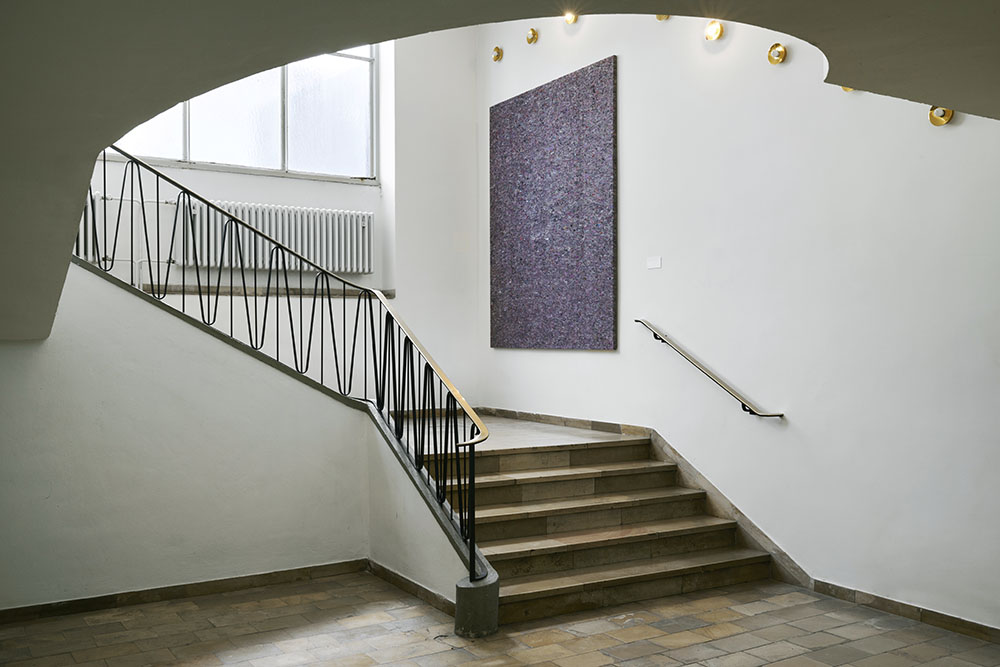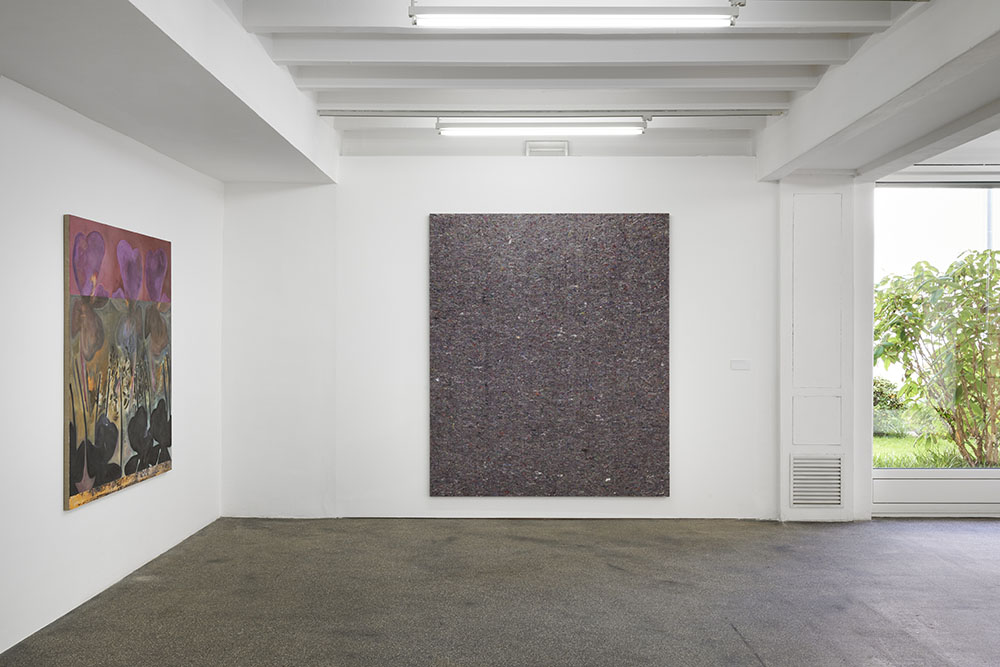 Merlin Carpenter, Courtesy dépendance, Brussels, 2016. Transit blanket on stretcher frame, 234 x 198.5 cm. Work on left by Nora Kapfer.