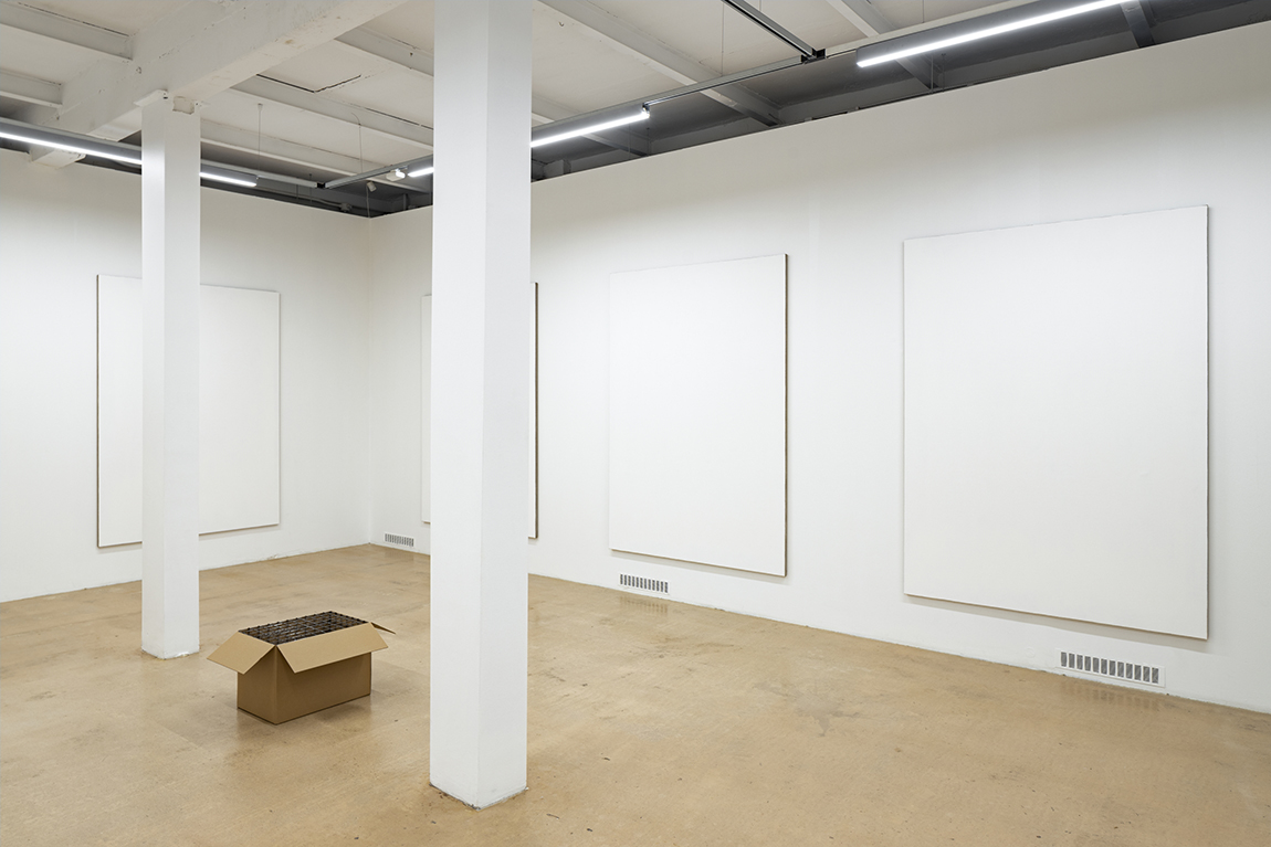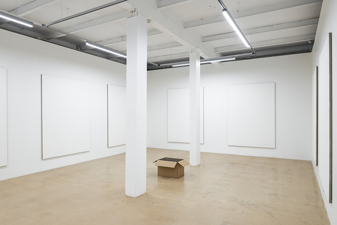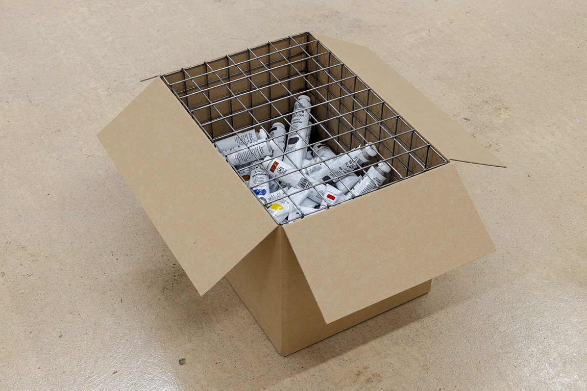 8 canvases acrylic primer on linen, cardboard box, aluminium wire mesh box, tubes of artists' oil paint